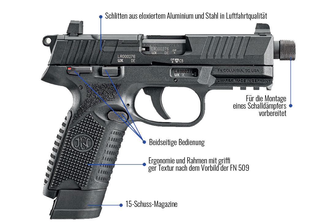 Die überragende Ergonomie, die bewährte Balance und die beidseitigen Bedienelemente – allesamt angelehnt an den größeren Bruder der FN 502, die FN509®– machen sie perfekt für Trainingseinheiten mit hohen Schusszahlen.