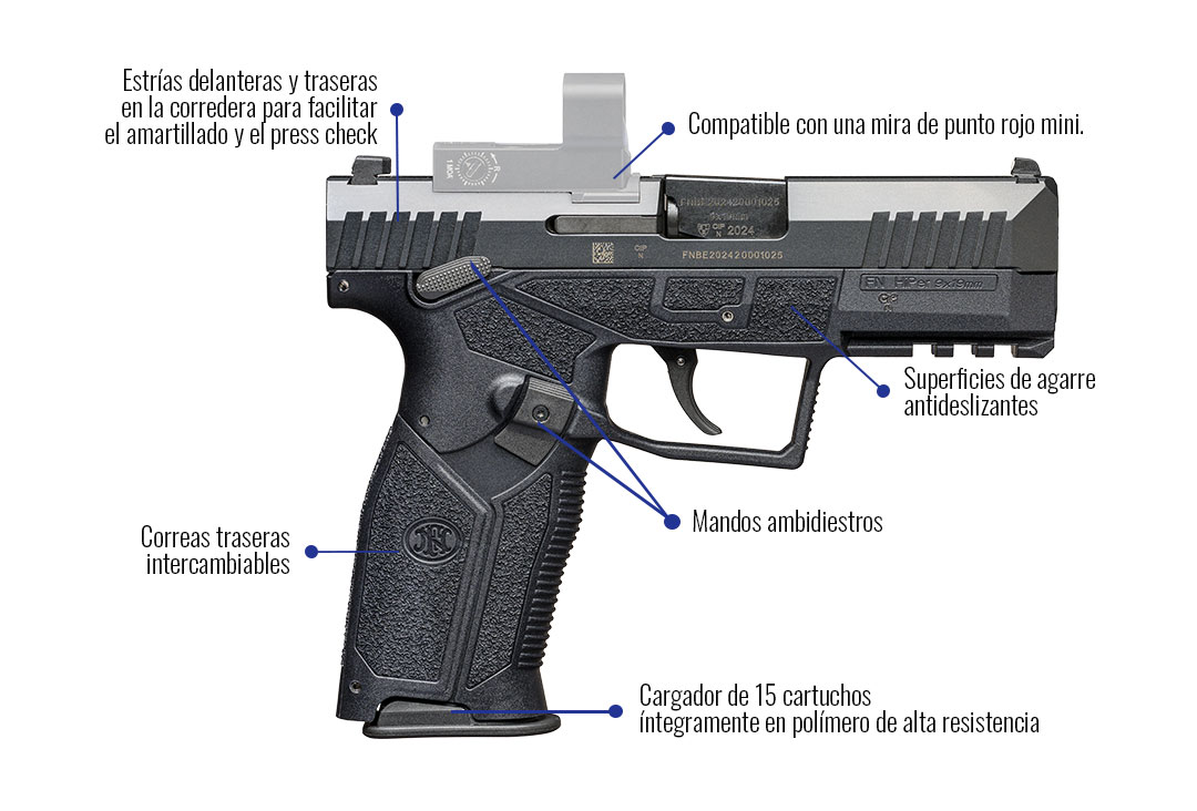Desde el primer momento, la FN HIPER® le inspira confi anza: las empuñaduras cubren gran parte del arma y garantizan un agarre óptimo. Las estrías de la corredera permiten manipularla fácilmente, incluso con las manos húmedas.