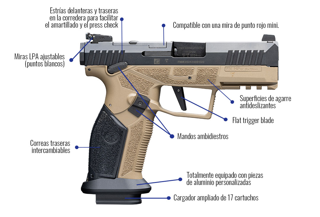 Desde el primer momento, la FN HIPER® le inspira confi anza: las empuñaduras cubren gran parte del arma y garantizan un agarre óptimo. Las estrías de la corredera permiten manipularla fácilmente, incluso con las manos húmedas.