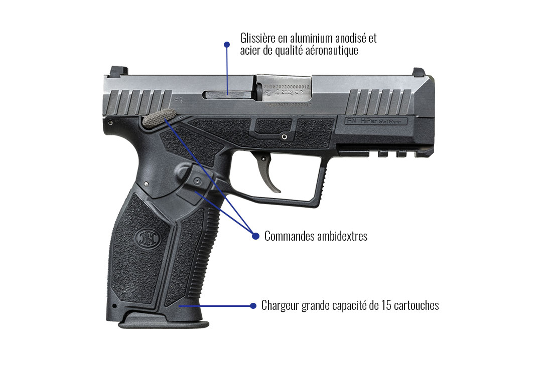 Grâce à tous ces détails vous avez un coup d’avance sur la concurrence. De plus, vous savez que le FN HIPER® ne vous laissera pas tomber. La fiabilité n’est pas un mot qu’on prend à la légère dans les ateliers de la FN Herstal, entreprise belge dont bon nombre d’armes sont une référence pour les utilisateurs les plus exigeants qui soient : les militaires. Peu importe l’intensité de votre séance de tir ou les munitions utilisées : le FN HIPER® percera les cibles aussi longtemps que vous le souhaitez.