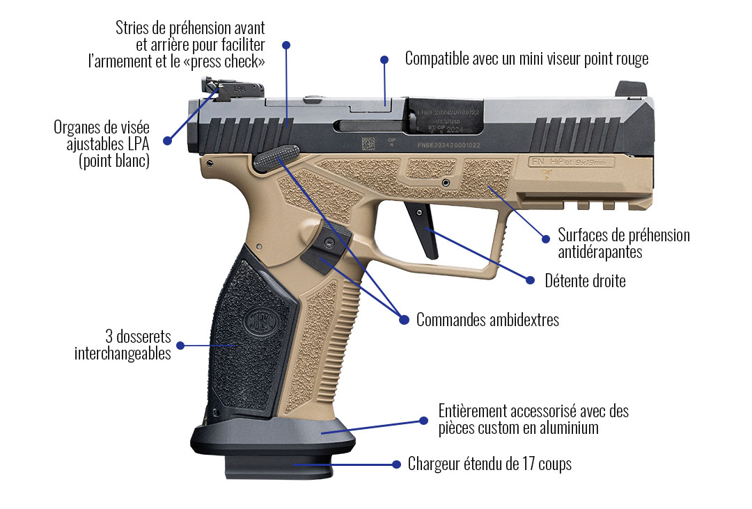 Les ingénieurs de la FN Herstal, entreprise belge réputée pour l’excellence et la fiabilité de ses armes, ont conçu le FN HIPER® en gardant en ligne de mire un mot d’ordre : ergonomie maximale. Au total, pas moins de 8 brevets déposés pour cette arme font du FN HIPER® une nouvelle référence dans le monde du tir.
