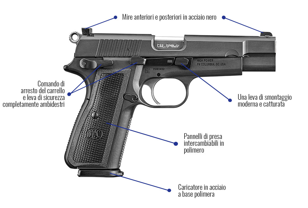 Con un peso di 1133 g, questo design robusto conserva un fermo del carrello allungato e integra comandi ambidestri per una presa intuitiva. La sua coda di castoro allungata e il cane rialzato assicurano un comfort ottimale. Progettato per uno smontaggio rapido e una manutenzione semplificata, il FN High Power garantisce un’alimentazione fluida delle munizioni moderne grazie alla rampa lucidata della sua canna martellata a freddo.